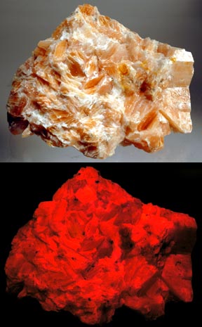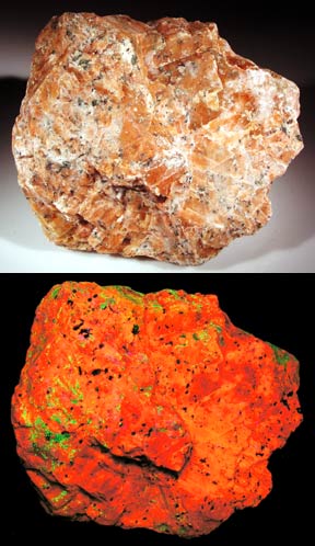 Calcite from the Franklin mine occasionally turns a beautiful salmon color. This is from the Mill site in Franklin. It fluoresces an exceptionally bright orange-red SW. The closer to the ore body the calcite is, the brighter it glows. Salmon calcite from the Sterling Hill mine in Ogdensburg was unheard of several years ago. Digging in the wall at the southeast corner of the Passaic pit in 2006 exposed some of the prettiest salmon calcite ever found. It fluoresces orange-red SW, but is not as bright as the Franklin material.