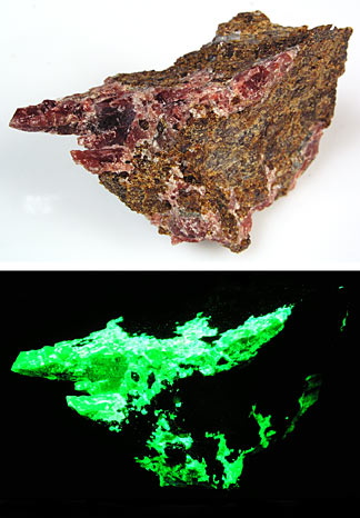 A white matrix with pink, radiating crystals of baratovite and black blades of aegerine from Dara-I-Pioz, Alai Range, Tien Shan, Tadzhikstan. The baratovite fluoresces bright pale blue SW. Purple amethyst-looking Franklin fluorite crystals sparsely disseminated in limestone and feldspar which fluoresces cherry red SW. The fluorite barely fluoresces SW and not at all LW, but there is a light blue white glow around the crystals SW. This was found at the Trotter dump of the Franklin mine. New Jersey Fluorescents, page 1
