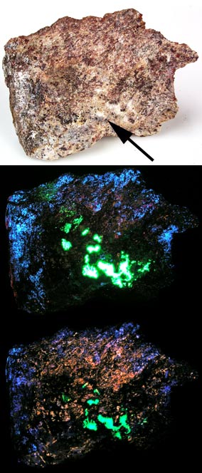 An unusual four-color polished slice of microcline, var. amazonite, with reddish fluorapatite, willemite, calcite, and augite from the Mill site, Franklin. This amazonite is blue-green and fluoresces gray-blue SW. The fluorapatite fluoresces burnt orange SW, the calcite fluoresces orange-red SW, and the willemite fluoreseces green SW. Here is an underappreciated fluorescent mineral from the Noble pit of the Sterling Hill mine. Most of it is now buried. It is scapolite. This piece has massive light grey scapolite and calcite. The scapolite fluoresces crimson red SW and the calcite fluoresces a bright orange-red SW. The host rock is incredibly tough to break. It takes two strong men to break off a few pieces.