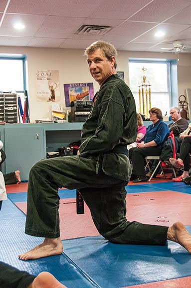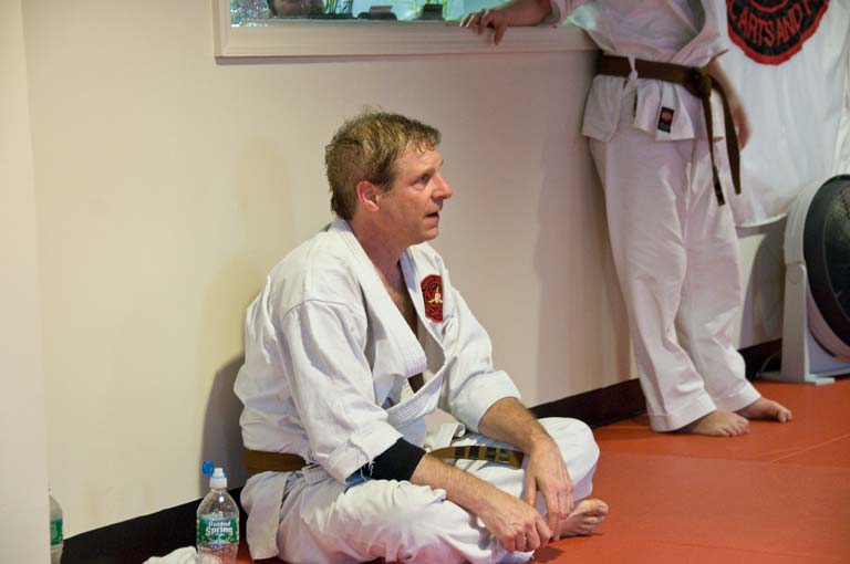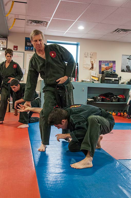 All students are actually enrolled in the school of Jujitsu. While they are training for belts in Jujitsu, they can also graduate with belts in karate. In the adult program, a person could get a black belt in Tae Kwondo karate in about 4 or 5 years. A black belt in Jujitsu takes about 9 to 10 years of study. I did not want to learn the katas (karate katas are executed as a specified series of approximately 15 to 25 moves, with stepping and turning, while attempting to maintain perfect form. The practitioner "visualizes" the enemy attacks and their responses.)
