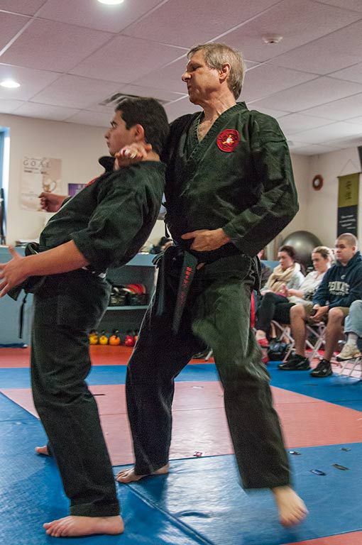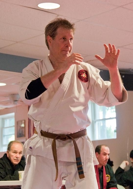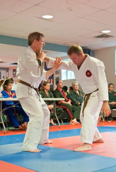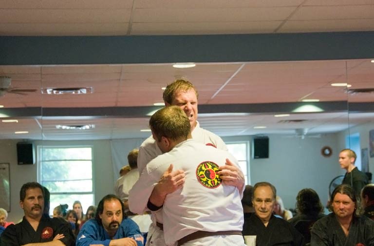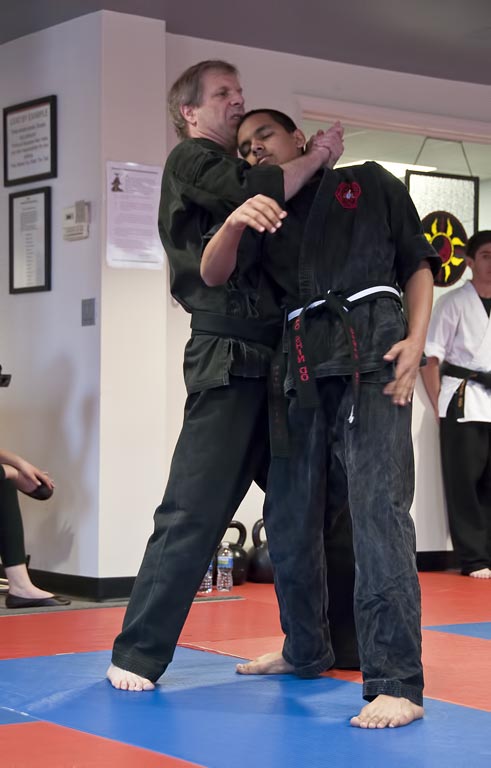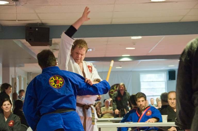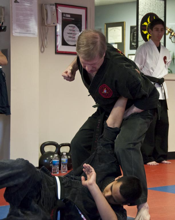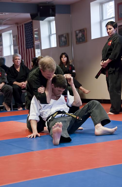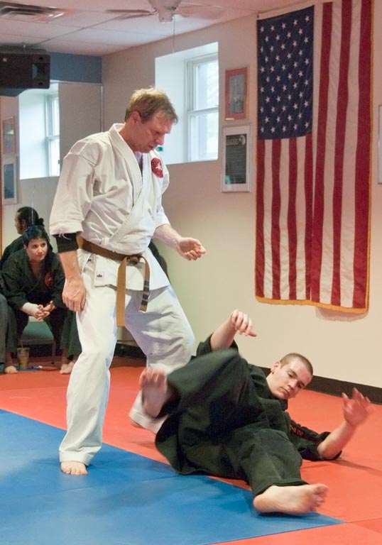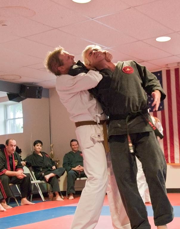 The 4th degree is all weapons - knives, clubs, guns, hands - and proficiency is the goal. The 2nd degree& 3rd degree tests are not quite as brutal. We needed to show what we have learned in the preceeding years (3rd degree everything is done with only one hand, both lefty and righty) and demonstrate control, accuracy, and skill. We worked with younger student "attackers" or ukes and we put them in pain and then threw them or subdued them. The object is to show our skill, but not damage them. Many thanks to our ukes for making their bodies available to us. All of them are black belts in the Karate system and junior black belts in our Jujitsu system.