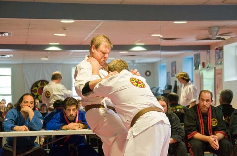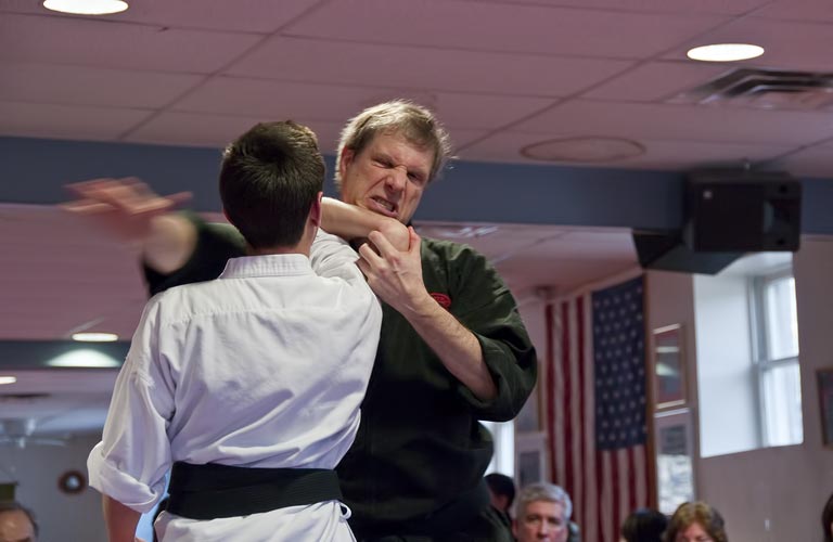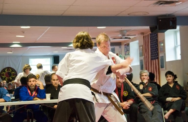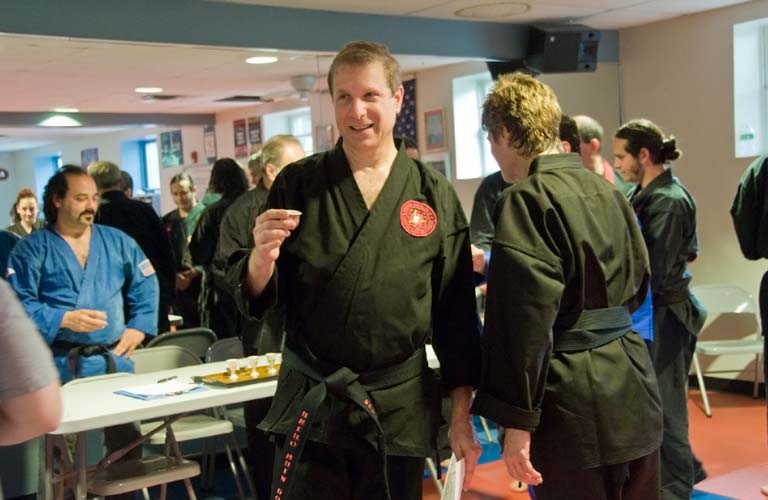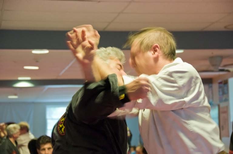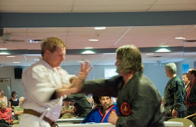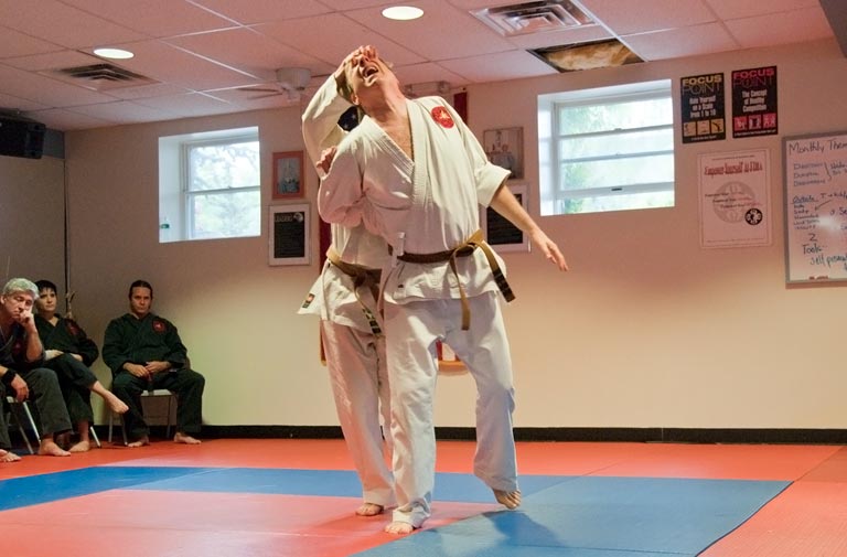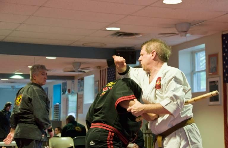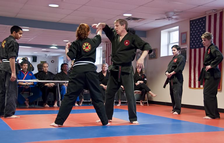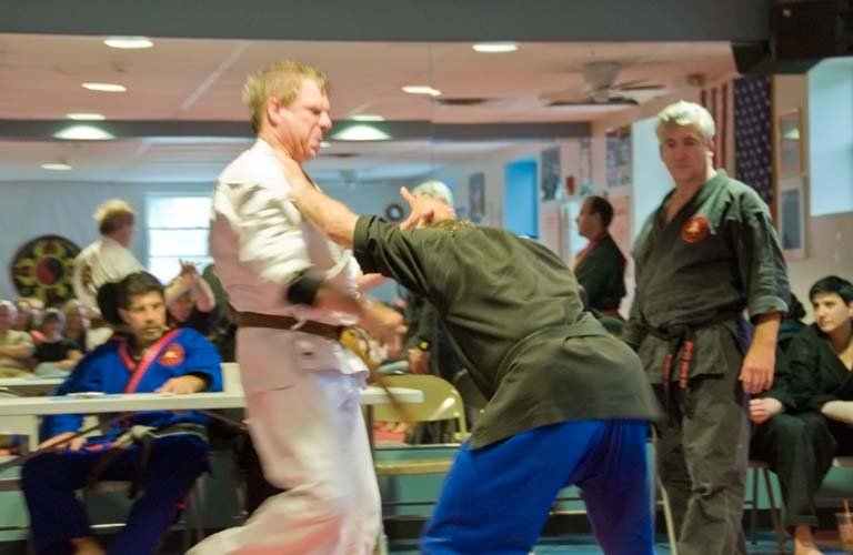 Our school trains us in self defense. We learn to parry attacks, break bones, dislocate joints, and in the extreme, kill our attackers. The training is intense. We are attacked with clubs, knives, fists, chokes, and grabs. We also learn defense against assailants with guns. Testing sees how well we have learned the different defenses to attacks and then at the end of each test, we have "dessert". In dessert, 4 people stand around you and take turns attacking you with weapons, grabs, or their fists. You must defend yourself and show that you can take down and disable your attacker, without actually injuring them. This is the control that you attain with years of training.