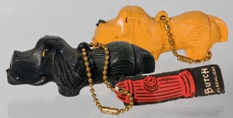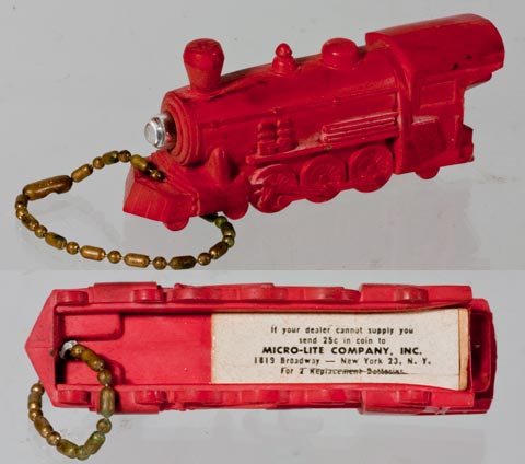| 1952 Micro-Lite "Butch" dog lights in two colors. Uses an "N" cell, these little guys are very cute. item #12-517, (SOLD) | 1952 Micro-Lite Train light. Uses an "N" cell. item #12-517, (SOLD) |