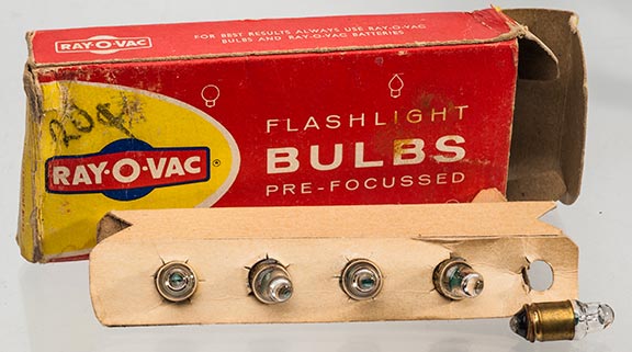 1950 Eveready, 5 #224 bulbs, 2.2 volts, 1 groove instead of threads. item #17-445, $4.00