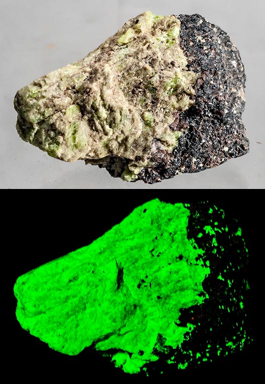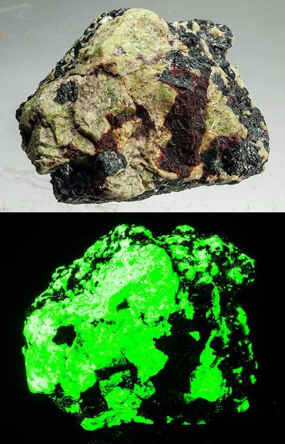 | Green willemite from the Franklin mine, Franklin, Sussex County, NJ. The willemite fluoresces green SW. It weighs It weighs 9.4 oz. and is 2.7 x 1.8 x 1.8 inches. $30.00, item #2465 | Green willemite with crystalline zincite from the Franklin mine, Franklin, Sussex County, NJ. The willemite fluoresces green SW. It weighs It weighs 10.0 oz. and is 2.5 x 2.1 x 1.3 inches. (SOLD), item #2637 |