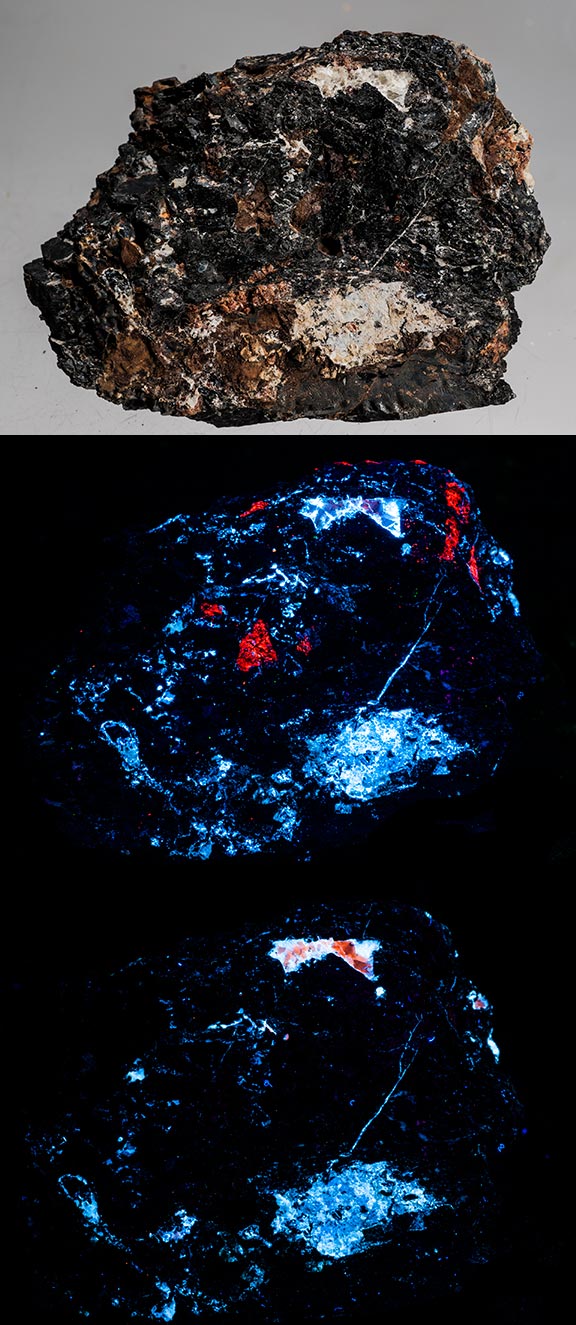 Rare calcite rhombs from the White Point quarry, San Juan Island, San Juan County, Washington State. The calcite fluoresces creamy white SW. It weighs 3.4 oz. and is 2.1 x 1.9 x 1.4 inches. $20.00, item #2653 |