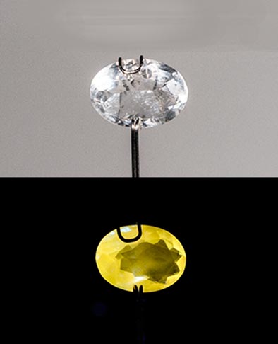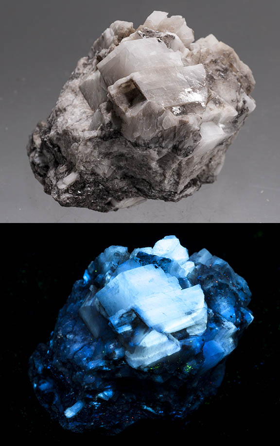 | From my collection - Faceted sodalite crystal from Sari Sung, Kokcha Valley, Badakhshan Province, Afghanistan. The sodalite fluoresces orange LW (shown) and white SW, & has a pale blue phosphorescence. It weighs 5/8 ct. and is 5.5 mm round. $34.00, item #962b (SOLD) | Very Rare, small cubic crystals of fluorescing chabazite on matrix from Harwinton, CT. The chabazite fluoresces green SW. Most chabazite does not fluoresce. It weighs 5.0 oz. and is 3.3 x 2.8 x 1.0 inches. (SOLD), item #2654 |