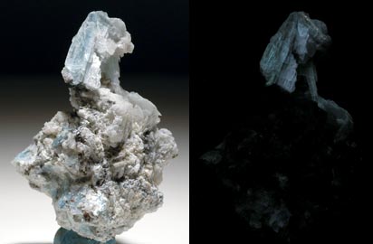 Calcite, willemite and hydrozincite (fluoresces white or sky blue SW). Hydrozincite is a surface coating on the rock. Hydrozincite forms when water (hydro) moves through the cracks in the rock and dissolves zinc. This material generally appears as a coating on rocks. This is from the Buckwheat dump, Franklin mine. Margarite, a rare Franklin fluorescent - Margarite crystals from the Franklin quarry, Franklin, NJ. Margarite is a blue-green mica that was sparsely found in a 75 foot wide area (now covered with tons of sand). The margarite fluoresces weak white SW & LW. It is 1.3 x 0.8 x 0.5 inches.