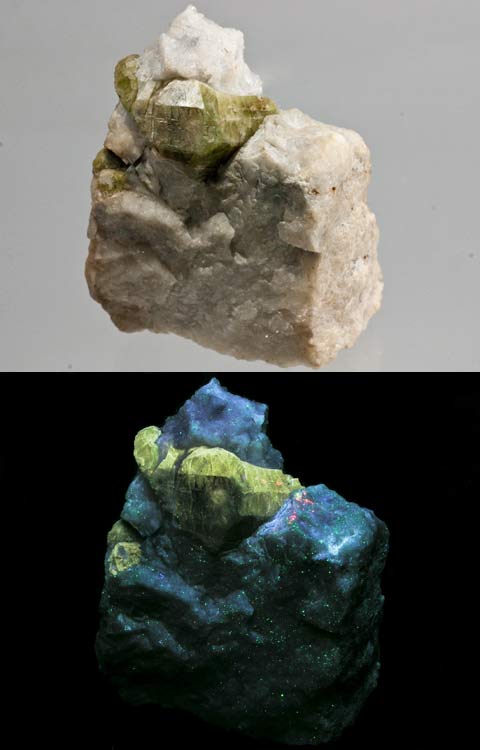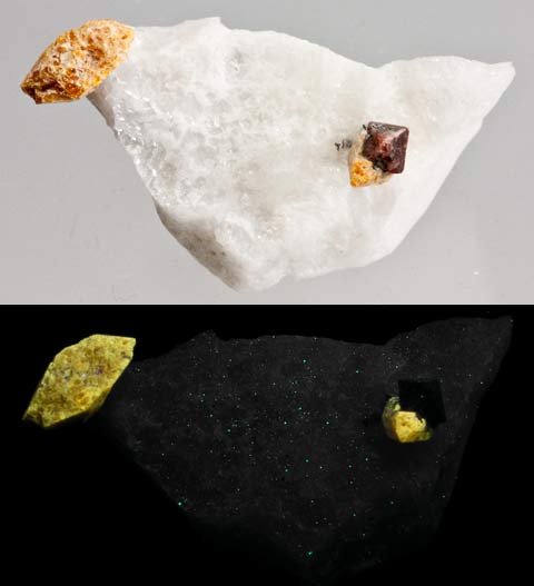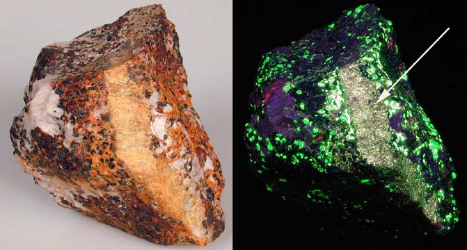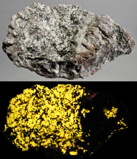 Third Find wollastonite with barite on calcite from the Franklin mine in Franklin, NJ. Wollastonite fluoresces orange-yellow SW and the barite fluoresces white SW. There are different Franklin wollastonites known as 1st Find, 2nd Find, 3rd Find, Fibrous, and then other wollastonites. 1st Find has large patches of bright wollastonite and often contains willemite or margarosanite. 2nd Find contains hardystonite. 3rd Find contains barite. Wollastonite can be found in different shades of yellow with some of the most appealing appearing orange. Franklin marble with a rich concentration of wollastonite and a touch of calite from the Sterling Hill mine, Noble Pit, Ogdensburg, NJ.