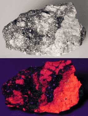 Calcite covered with galena. The calcite fluoresces orange-red SW. Rose-colored Franklin rhodonite. It is nonfluorescent but has some willemite in it.