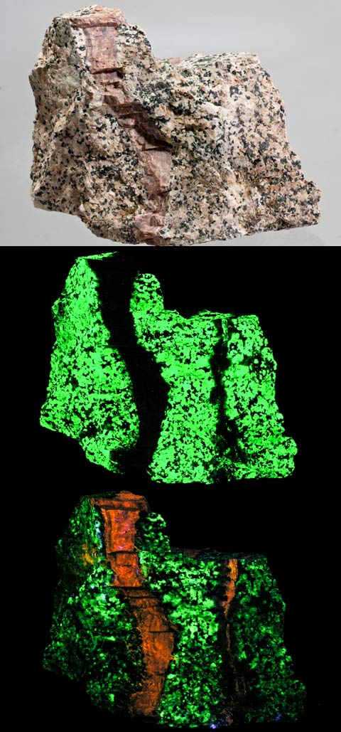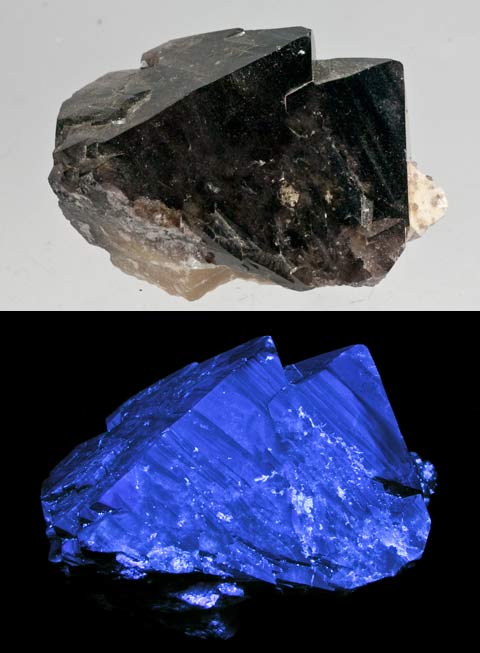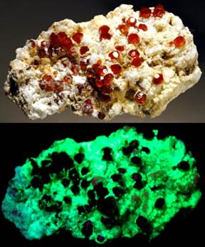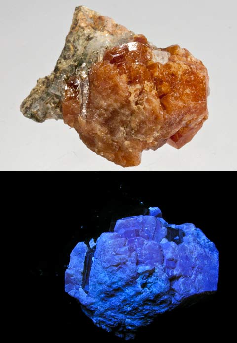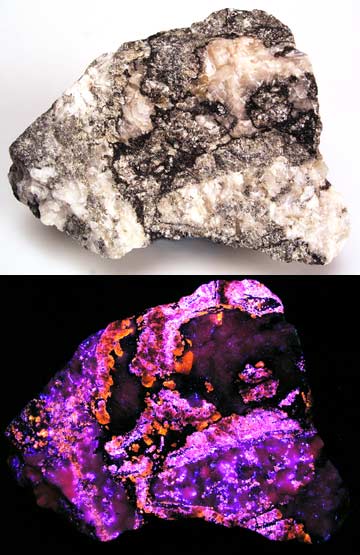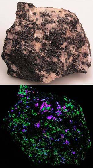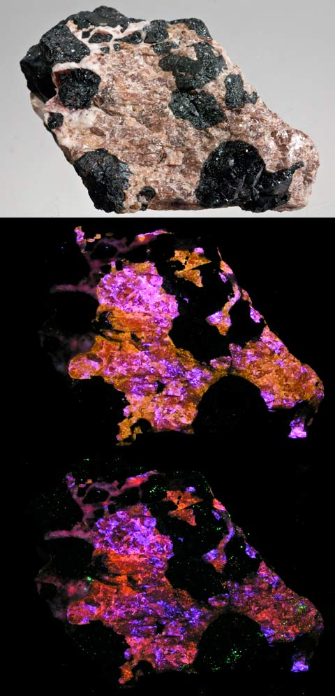 This shows a good reason to have both a SW and LW UV lamp. This is from the Sterling Hill mine with two veins of sphalerite running through it. Under SW the sphalerite barely fluoresces and shows up as a dark vein. The willemite fluoresces green SW. Under LW, the sphalerite jumps out as fluorescing orange veins. A rare golden sphalerite with franklinite from the Franklin Mine, Franklin, NJ. The sphalerite fluoresces gold with blue highlights LW and pink & blue SW.