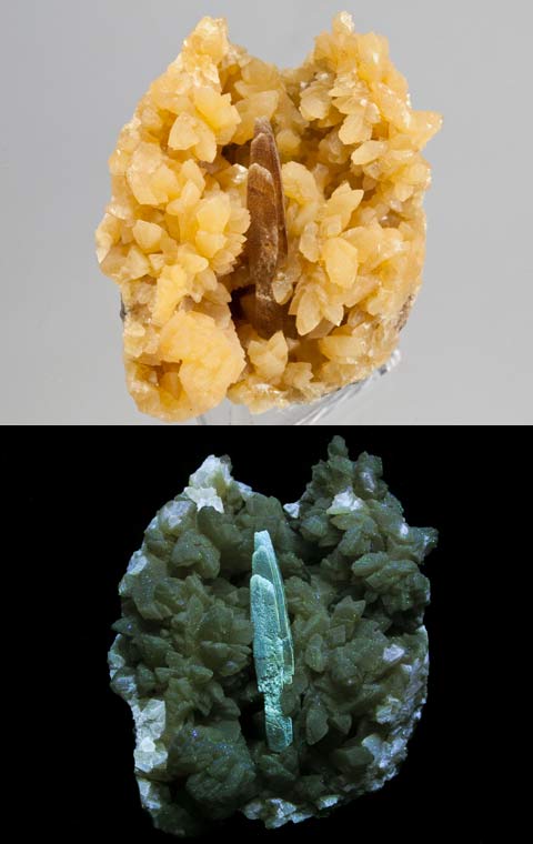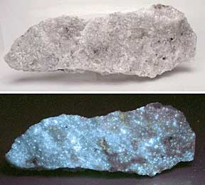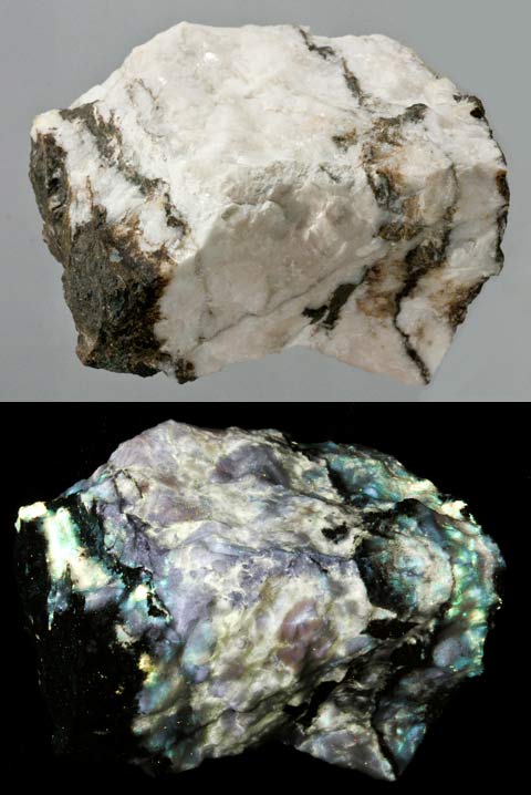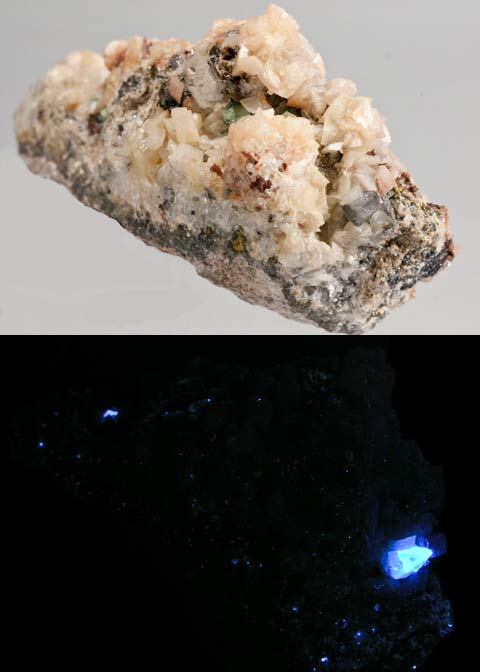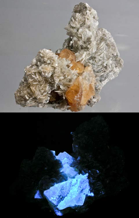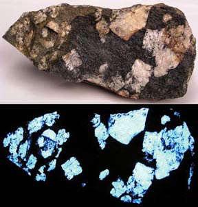Diopside and phlogopite from Pierrepont, New York. Diopside fluoresces bright pale blue SW, phlogopite fluoresces yellow-orange SW.