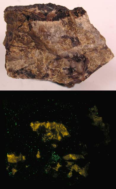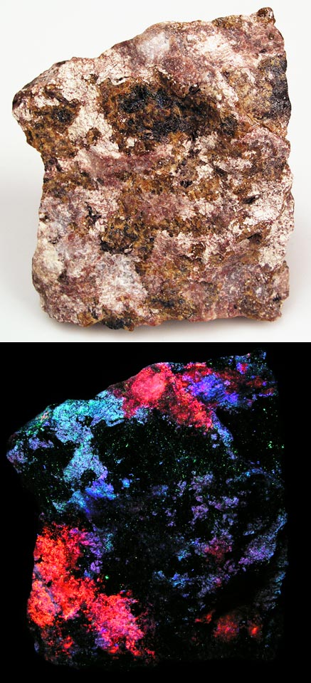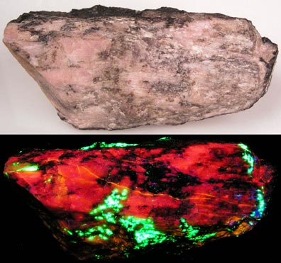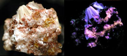 A very rare fluorescent bustamite from Franklin, NJ. Most bustamite does not fluoresce. This one is especially bright red SW. You can also see some clinohedrite on the bottom with a few specks of hardystonite on the right side. Franklin xonotlite (purple-blue-fluorescing) with hyalophane (fluoresces red) from the Franklin mine, Franklin, NJ. Shown under SW.