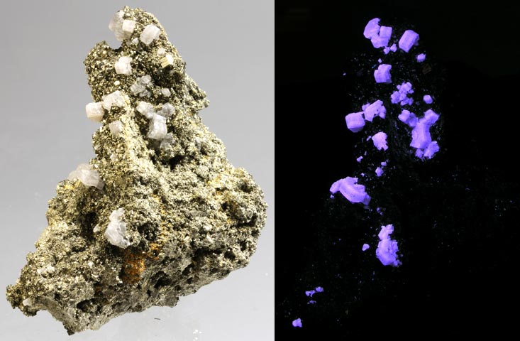 Fluorapatite on pyrite crystals from Huanzala, Huanuco Department, Peru. The apatite fluoresces lavender SW. It weighs 6.8 oz. and is 3.3 x 2.0 x 1.5 inches