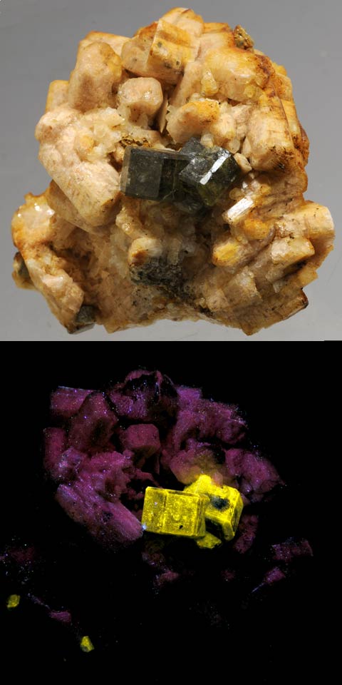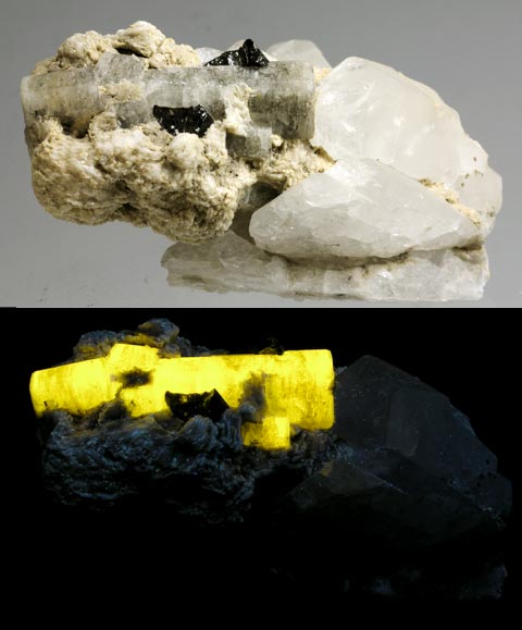 An unusual pink-orange-fluorescing fluorapatite from the Taylor Road dump in Franklin, Sussex County, NJ. The fluorapatite fluoresces pale pink-orange SW and MW. It weighs 8.5 oz. and is 2.8 x 2.0 x 1.7 inches. Fluorapatite on quartz from Shigar valley, Skardu district, Pakistan. It fluoresces bright yellow under SW. The apatite crystal is 2 inches long. The piece weighs 8.3 oz. and is 3.5 x 2.5 x 2.0 inches.