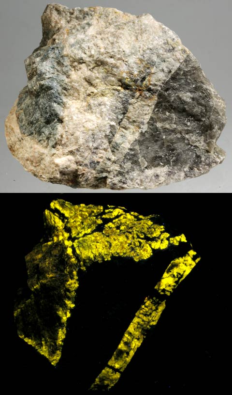Cuspidine. A small quantity was found by Dru Wilbur among stones used for an old mill foundation in Franklin, NJ. This is from that find. This Cuspidine fluoresces orange under SW and rose pink under MW. It weighs 3.0 oz. and is 2.0 x 1.6 x 1.0 inches. An example of fluorapatite with quartz, feldspar & muscovite mica from the Harding Pegmatite, Taos County, New Mexico. It fluoresces yellow SW and brighter yellow MW. It weighs 2 lb 3.0 oz and is 4.5 x 4.0 x 2.5 inches.