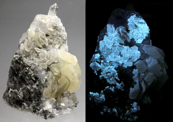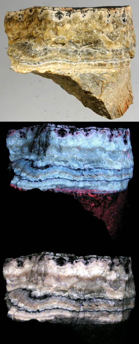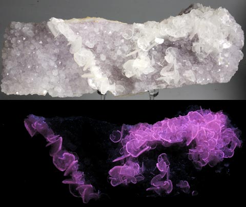 Calcite from Terlingua, Texas. Terlingua fluoresces light blue SW, pink LW and has a long-lasting phosphoresence. It weighs 10.5 oz and is 4.0 x 4.0 x 2.0 inches. Calcite from Cloford quarry, Mendips, Somerset, England. This calcite fluoresces white and red-orange under SW and cream under LW (bottom photo) and has a long-lasting phosphorescence. The piece weighs 5.5 oz. and is 2.8 x 2.0 x 1.5 inches.