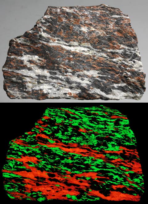 Willemite and Calcite that were compressed (mylonitized) over millions of years with franklinite from the Nason fault,1250 stope, Sterling Hill mine, NJ. The willemite fluoresces green, the calcite red-orange SW. It weighs 14.0 oz and is 3.8 x 2.5 x 1.3 inches. Calcite from the Christmas Gift mine, Darwin, California.
