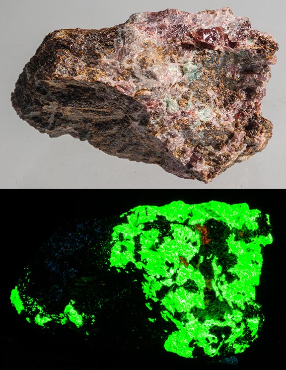 Agrellite from Kipawa Complex, Temiscamingue RCM Quebec, Canada. The agrellite fluoresces pink SW and LW. There is a SW green fluorescent patch that can be uranyl calcite. It weighs 4.8 oz. and is 3.5 x 2.5 x 1.0 inches. (SOLD), item #2651 |