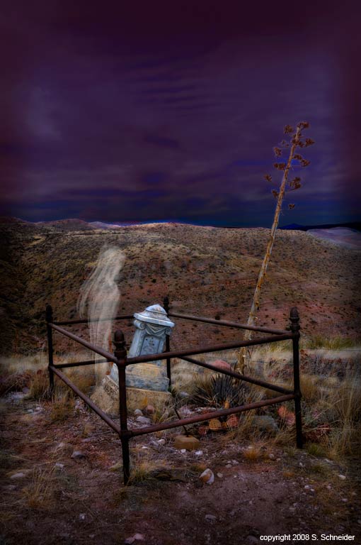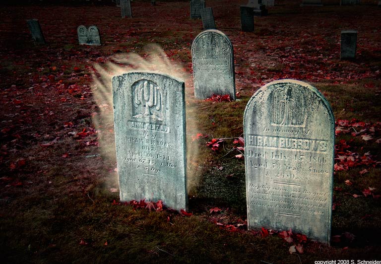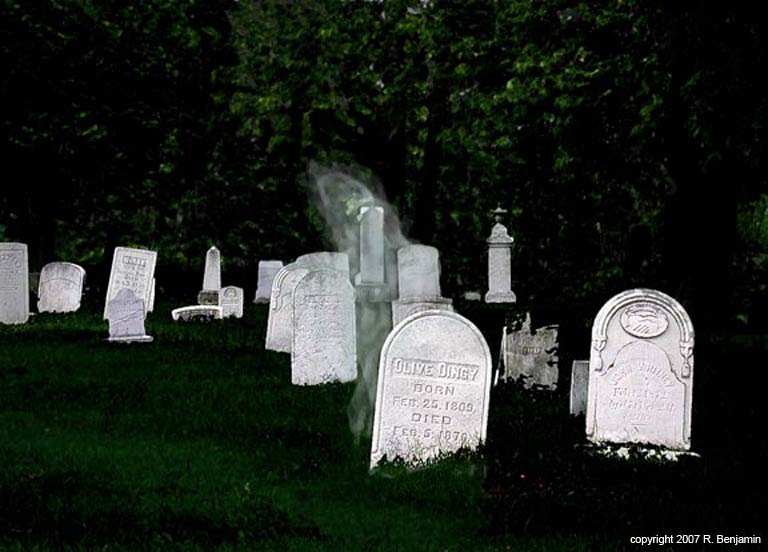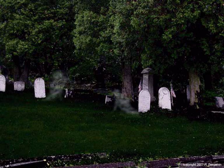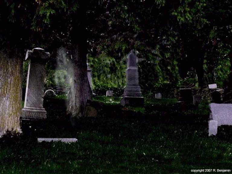 Ghosts In The Cemeterypage 2 - Pennsylvania, NJ, & Arizona Cemeteries There are different kinds of ghosts and ghost hunters have categorized them into types. Parts of the descriptions of hauntings are taken from The Ghost Hunter's Guidebook by Troy Taylor, 1999 Whitechapel Productions Press (www.prairieghosts.com): The Intelligent Haunting - These are the ghosts of people who were once living, but because of a traumatic event or unfinished business, have not passed over to the other side. These ghosts have been known to interact with people. Stories exist of ghosts that led people to their hidden grave site or the proof of a crime. Replay Ghosts or The Residual Haunting - These ghosts appear or cause smells or sounds, but do not interact with the living. Examples are footsteps on stairs or apparitions in a room. The possible explanation is they are like a tape recording, played over and over again. Somehow the places where they appear store up the energy of the past and allow it to keep replaying. Cemetery Ghosts or Portal Hauntings - The entranceway to the other side. This may be location of the openings in the veil during October. Rebecca has found that cemeteries are one of the best places to photograph ghosts as they attempt to cross over into the world of the living. Cemetery humor: Two young men were walking home from a dance when one suggested that they take a shortcut through the cemetery. The second protested since it was a moonless, spooky night, but the first talked him into it. As they were approaching the middle of the cemetery, they heard a tapping sound that raised the hairs on the back of their necks. The first suggested that they check out the source of the sound and the second reluctantly agreed. As they parted some bushes, they saw an old man chiseling something on a headstone. The young men said, "Mister, you nearly scared us to death, we had no idea what was causing that sound. What are you doing anyway?" The old man slowly turned to them and said "The idiots spelled my name wrong." Original signed photos are available matted. They can be ordered from Stuart Schneider, 820 Kinderkamack Road, River Edge, NJ 07661. All photos are copyright 2000 through 2025, R. Benjamin & S. Schneider |