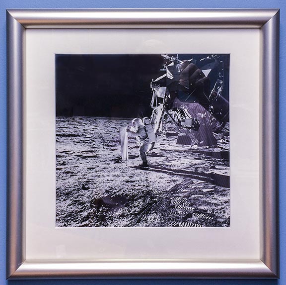 | Original photograph of Buzz Aldrin setting up the solar sail on the moon from Apollo 11. Taken by Neil Armstrong with the square format Hasselblad camera. |