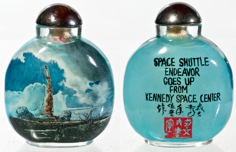 Chinese snuff bottle, 3 inches tall, showing the launch of the Endeavor Shuttle, painted on the inside of the bottle by Jia Yi of Hebei, China in 2001
