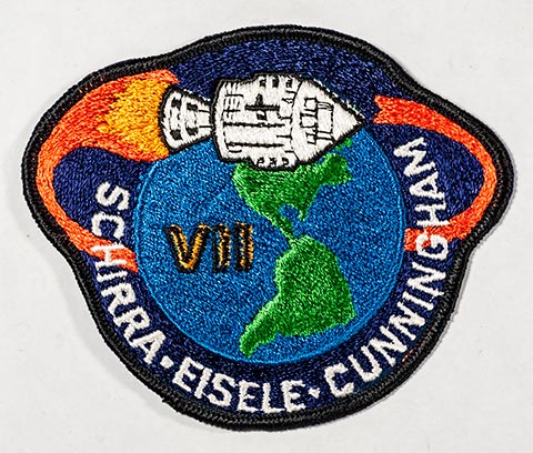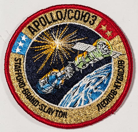 | Apollo 7 embroidered cloth space suit patch. It is 4 3/4 inches wide. item #16-101, $12.00 | Apollo-Soyez embroidered cloth space suit patch. It is 4 inches wide. item #16-102, $12.00 |