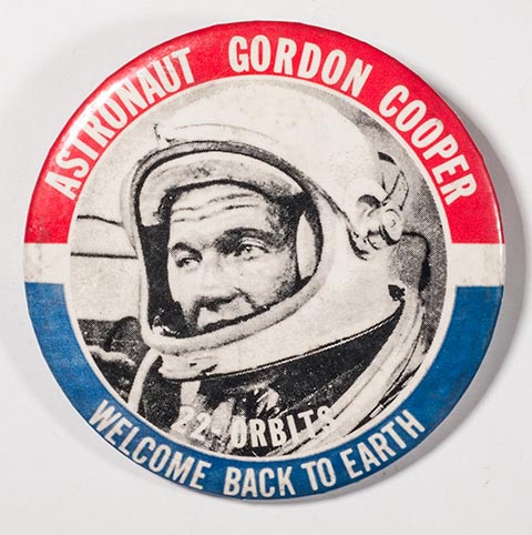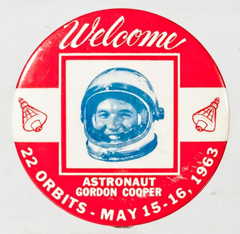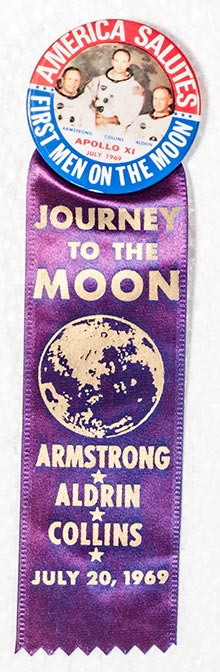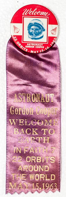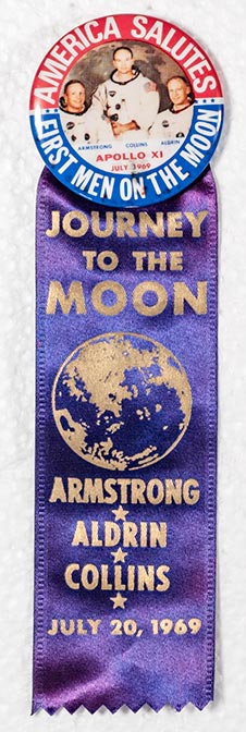 May 15, 1963 Welcome Back Gordon Cooper pin & ribbon, Mercury space program, button 1 3/4". item #16-106, $20.00 July 20, 1969 Journey to the Moon pin & ribbon, Apollo space program, button 1 3/4". item #16-119, $12.00 July 20, 1969 Journey to the Moon pin & ribbon, Apollo space program, button 1 3/4". item #16-122, $12.00