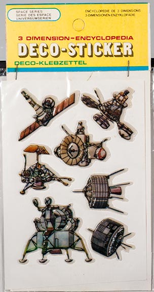 | 1970 sheet of 3D space stickers. $6.00, item #16-114 | 1982 Space Shuttle STS-2 ABC News button pass, 2 1/4inches in diameter. item #16-135, $12.00 |