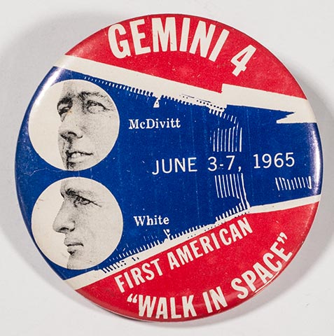 1965 Gemini 4 First Walk In Space, 3.5 inches in diameter. item #16-128, $20.00 3.5 inch wide, 1963, 22 Orbits Gordon Cooper button, it is 3.5" wide. item #16-129, $18.00