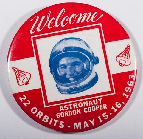 1982 Space Shuttle STS-4 button, 3 inches in diameter. item #16-120, $10.00 3.5 inch wide, 1963, 22 Orbits Gordon Cooper button, it is 3.5" wide. item #16-121, $18.00