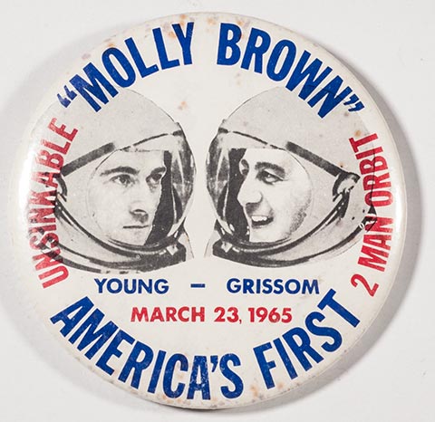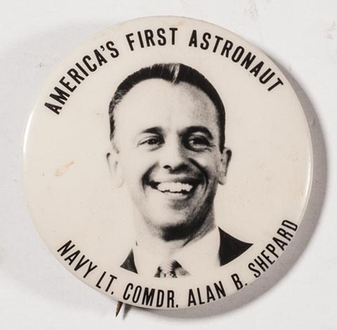 Rare America's first astronaut, Alan B. Shepard, flew aboard "Freedom 7" on May 5, 1961. Our first program of sending astronauts into space was the Mercury Program, 1 3/4 inches in diameter. item #16-134, $16.00 1965, Gemini, Young & Grissom, button, it is 3.5" wide. item #16-131, $18.00