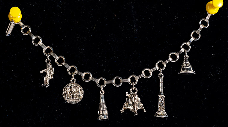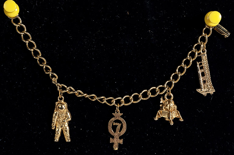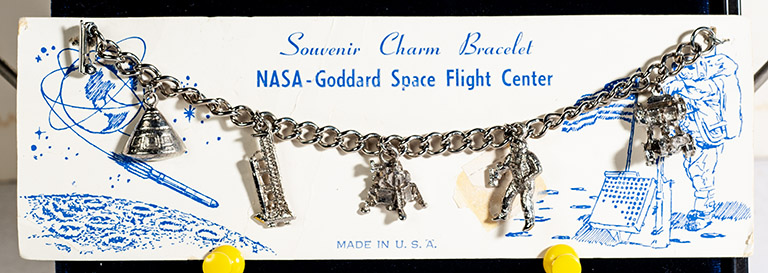 | 1969 Apollo gold plated charm bracelet from Kennedy Space Ctr. item #25-202, $15.00 | 1969 charm bracelet from NASA Goddard Space Center gold tone. item #25-203, $20.00 |