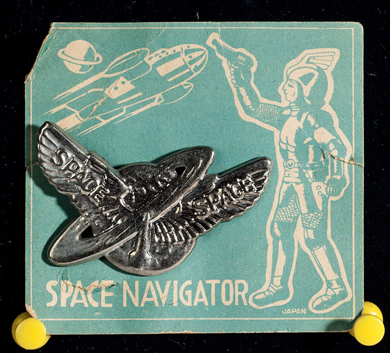 1958 Space Satellite Japanese lithographed tin whistle, about 2.5 inches tall. $16.00, item #16-205 1982 Space Shuttle STS-5 ABC News button pass, 2 1/4inches in diameter. item #16-137, $10.00
