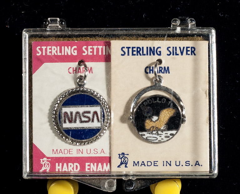 | 1950 Tin, silver tone Space Navigator pin. item #25-212, $15.00 | 1969 Apollo Hard Enamel, Sterling Silver charms from the NASA Goddard Space Ctr. item #25-213, $30.00 |